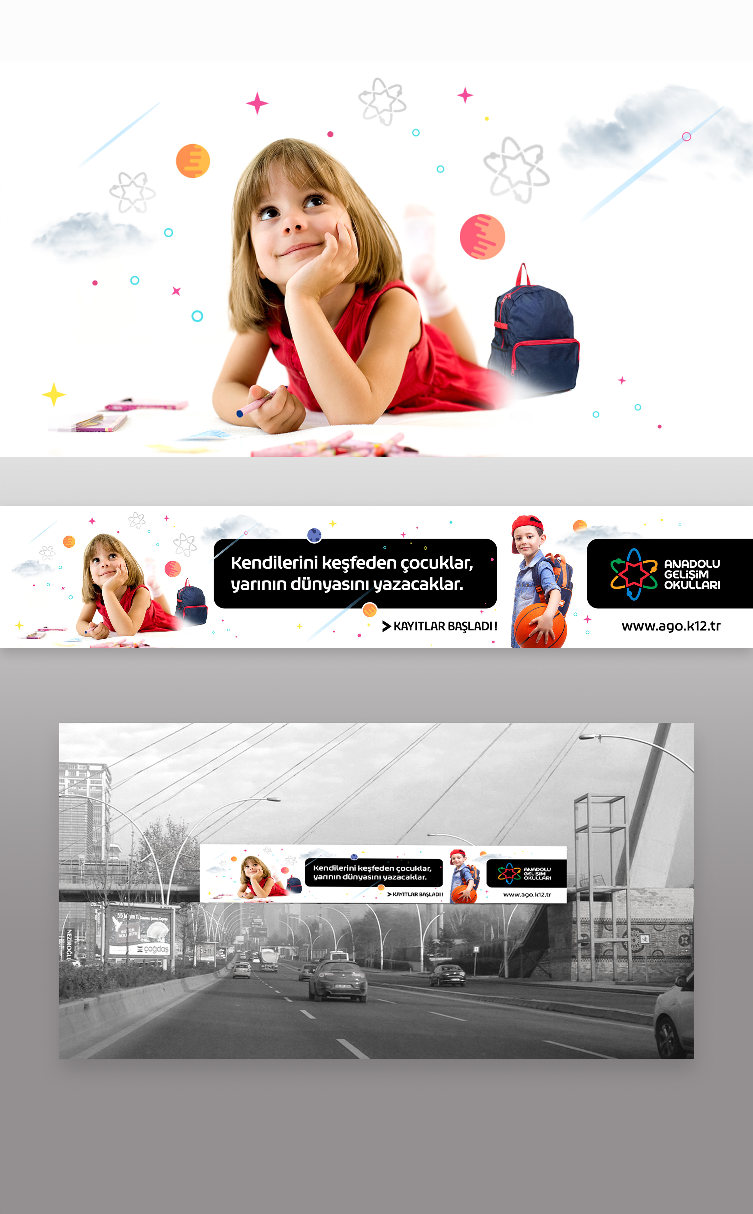 For Anadolu Gelişim Okulları, creating outdoor visuals for a children’s school meant balancing vibrancy and clarity. I designed engaging, playful yet professional graphics that enhance the school’s welcoming atmosphere.