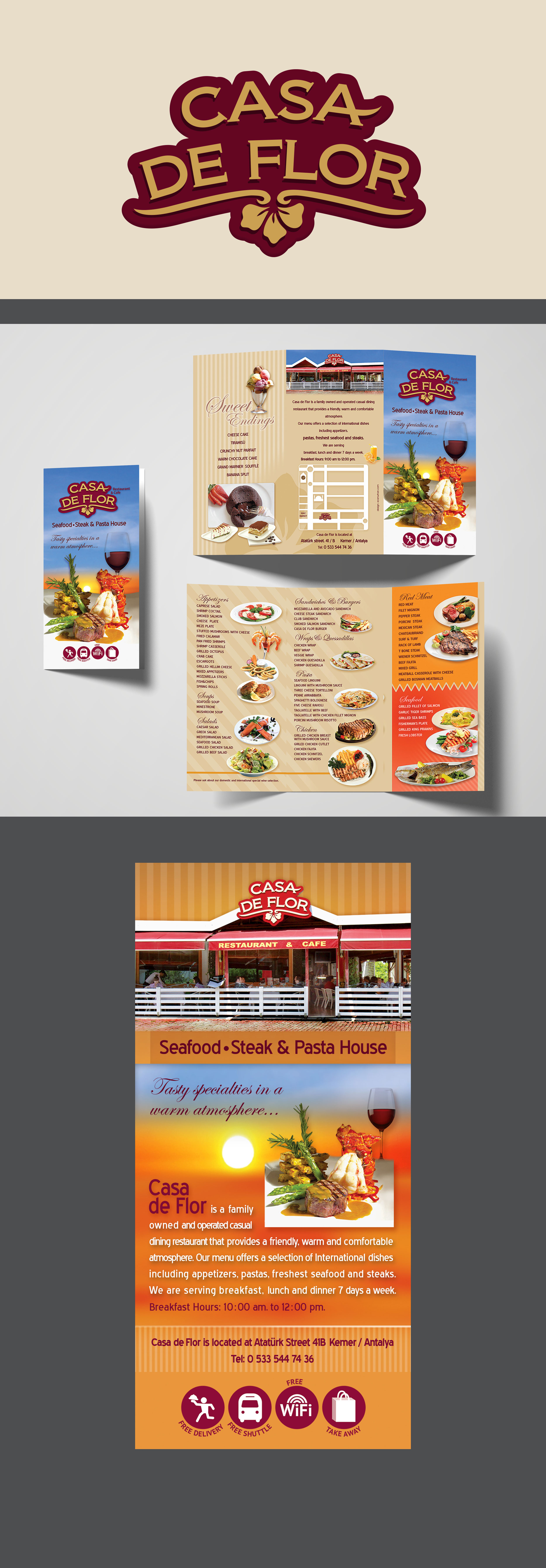 I crafted the logo, brand identity, brochure, and menu designs for Casa De Flor. The visual identity blends a relaxed yet sophisticated feel, capturing the restaurant’s seaside charm and refined dining experience.