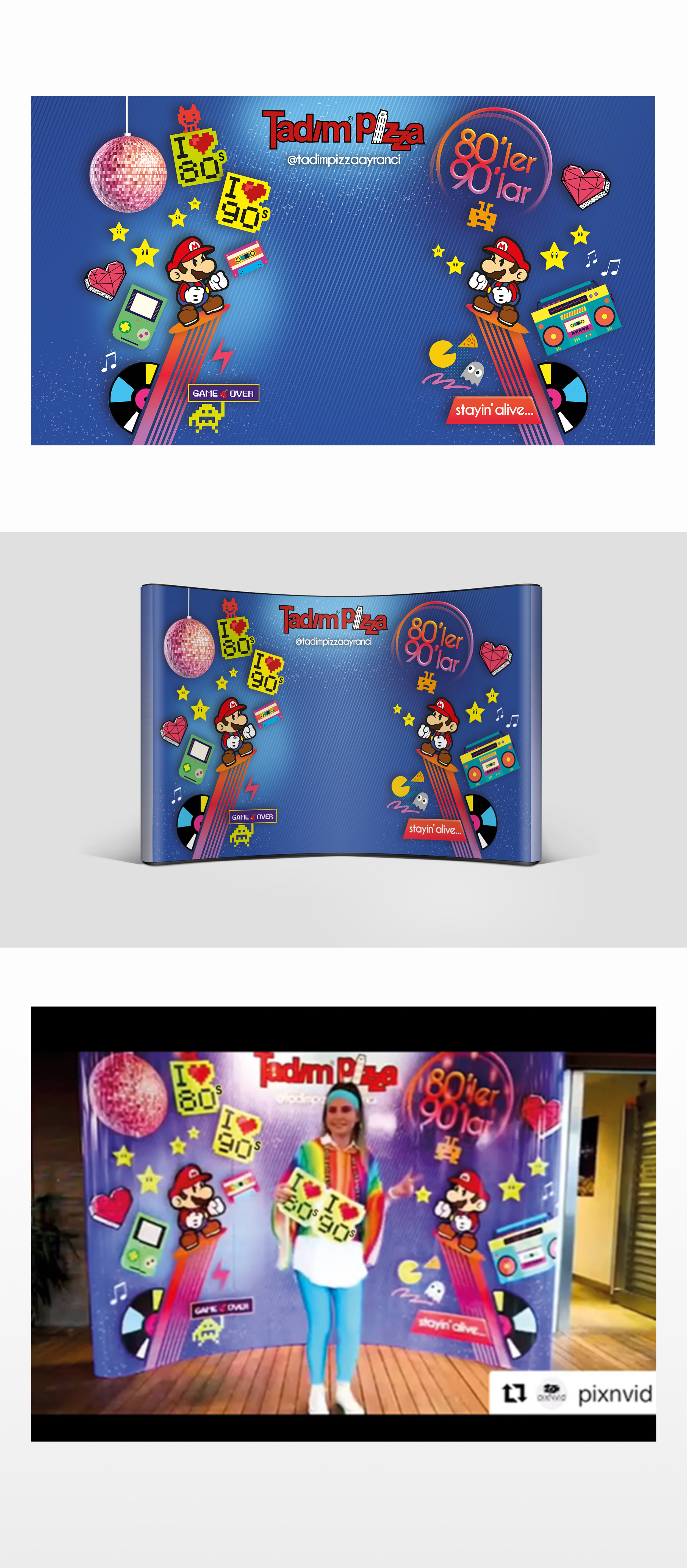 I created a pop-up display stand design for Tadım Pizza’s 80s and 90s themed event party. The design incorporates retro elements and vibrant colors, evoking nostalgia and enhancing the event’s ambiance.