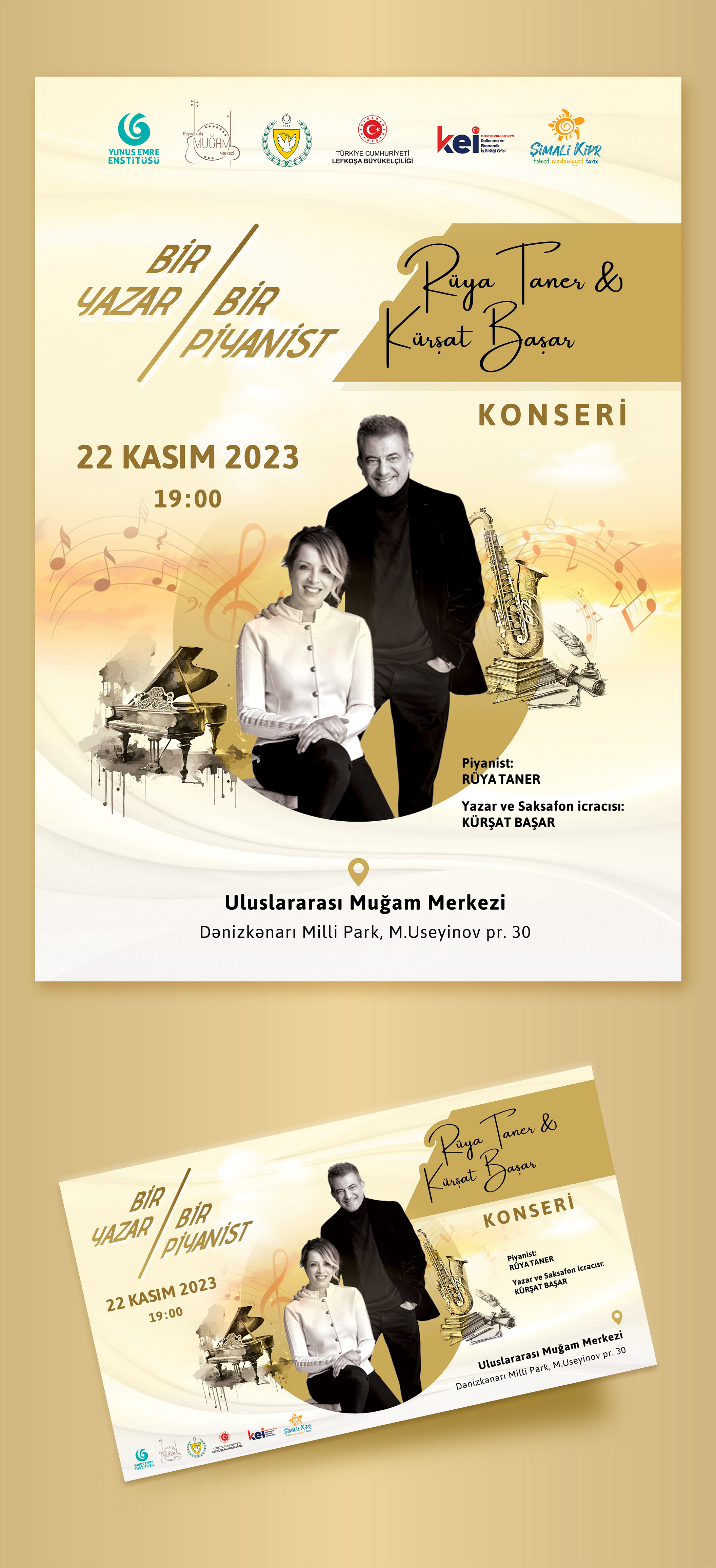 For the writer and pianist duo concert, Rüya Taner (pianist) – Kürşat Başar (Journalist, writer & saxophone player), I designed a visual identity that harmonizes literature and music. The poster, invitation, and social media visuals reflect the poetic rhythm, creating an elegant and immersive experience for the audience.